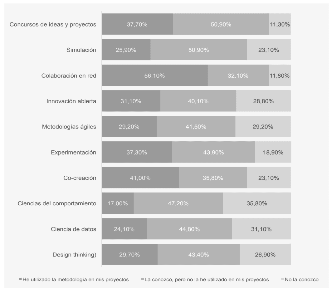 Un informe posterior de Long & NovaGob.Lab (2018) amplía esta transparencia mediante una encuesta empírica a profesionales, identificando qué metodologías son más conocidas y utilizadas en el trabajo en innovación pública. Como se muestra en la figura 4, el informe ofrece un gráfico que hace visibles los métodos de innovación y conecta el discurso metodológico con la práctica, traduciendo marcos conceptuales en tendencias observables. La discusión que acompaña al gráfico señala que los niveles de familiaridad y aplicación práctica superan el 70% en la mayoría de las categorías, lo que evidencia una cultura metodológica diversa pero desigual.