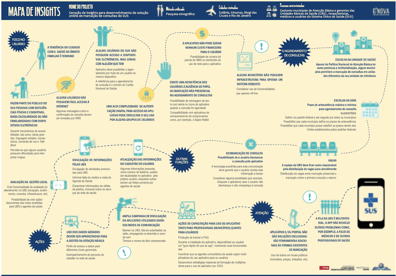 Un caso igualmente eficaz de reporte metodológico proviene de GNova, el laboratorio federal de innovación pública de Brasil alojado en ENAP, la Escuela Nacional de Administración Pública. En su publicación Experimentação e novas possibilidades em governo (Ferrarezi, Lemos, & Brandalise, 2018), el laboratorio documenta investigación etnografía con usuarios del Sistema Único de Salud (SUS) mediante un Mapa de Insights (figura 3) que traduce las observaciones cualitativas en una narrativa visual de barreras y oportunidades. La figura traza todo el recorrido del paciente, desde el primer contacto hasta la entrega del servicio, destacando obstáculos administrativos, comportamientos ciudadanos y posibles acciones de política pública. Al vincular los hallazgos con intervenciones de diseño, el mapa transforma datos de campo en un marco compartido para la toma de decisiones. Este enfoque ejemplifica cómo la visualización puede funcionar tanto como método de investigación como herramienta de comunicación, convirtiendo la complejidad en claridad. En el trabajo de GNova, la documentación no es resultado final, sino un acto de diseño: uno que preserva el aprendizaje y hace visible la memoria institucional.