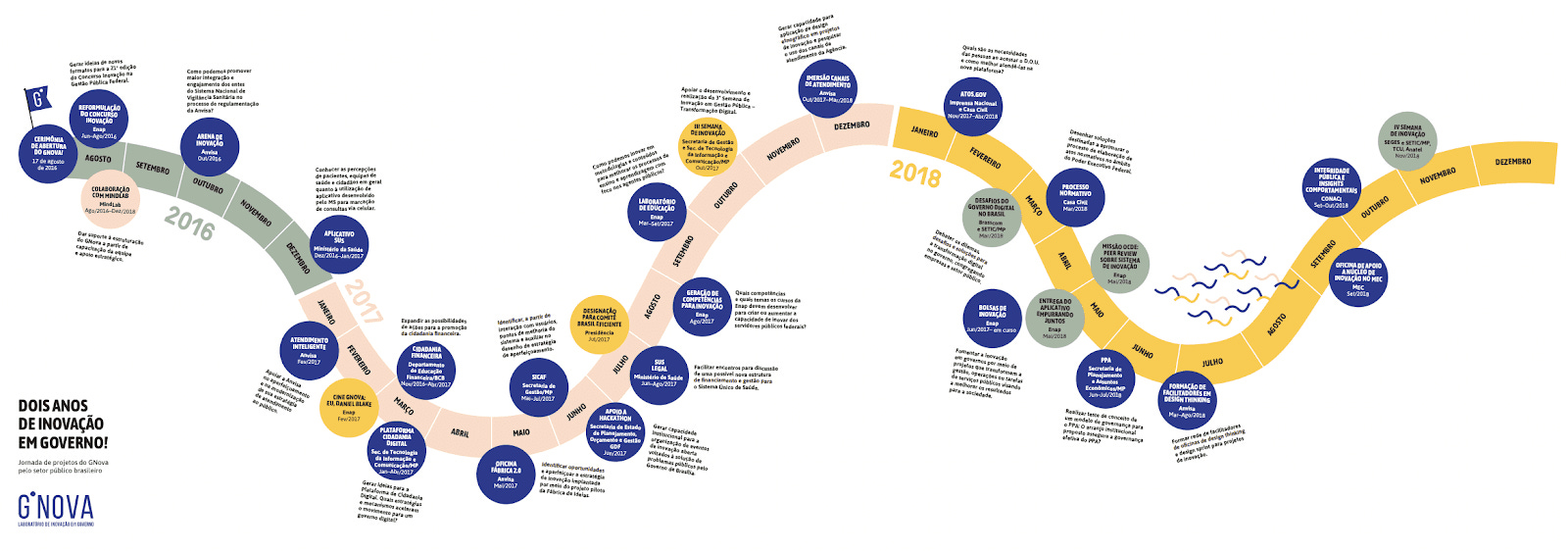 Los ejemplos más detallados van aún más lejos, especialmente cuando visualizan la continuidad dentro de una misma institución. Ferrarezi, Lemos y Brandalise (2018) documentan dos años de la evolución de GNova mediante una línea de tiempo que traza cada experimento realizado entre 2016 y 2018 (figura 6). Cada proyecto aparece en secuencia, mostrando aliados, plazos y ámbitos de política pública, desde las primeras colaboraciones hasta la posterior expansión hacia iniciativas en educación, salud y gobierno digital. Al mapear estos hitos como un flujo continuo, la figura convierte proyectos dispersos en una narrativa coherente. Esta visualización demuestra cómo una documentación sistemática puede preservar el aprendizaje organizacional, otorgando profundidad temporal y sentido a la experimentación en el sector público.