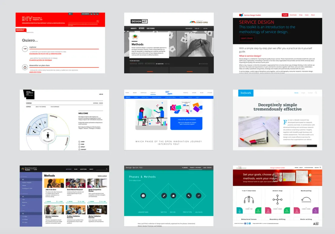 (Podemos encontrar muchos más, como por ejemplo:, 100 Open Innovation Toolkit, Livework, Open Innovation Mozilla, Standford d.school, Design Sprint GV, Media Lab Amsterdam , Service Design Toolkit (Namahn and Fladers DC), This is Service Design Doing, Board of Innovation, entre otros).